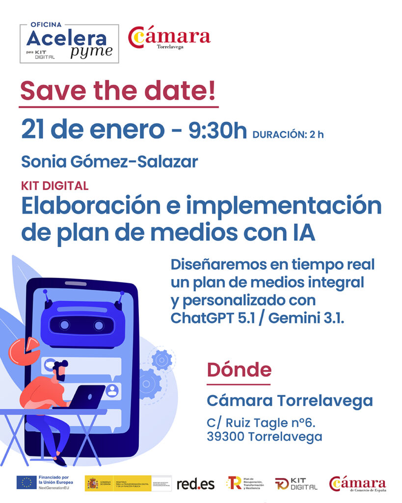 Comenzamos Enero con la jornada “Kit Digital: Elaboración e implementación de plan de medios con IA” , última del ciclo de IA que organiza la Oficina AceleraPyme de la Cámara de Torrelavega, donde daremos el paso definitivo de la teoría a la práctica. Aprovechando la capacidad de procesamiento y razonamiento avanzado de ChatGPT 5.1 y Gemini 3.1, presentados en las jornadas anteriores, trabajaremos en tiempo real para diseñar un plan de medios integral y personalizado.